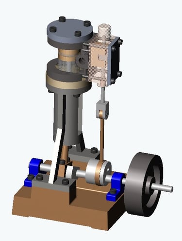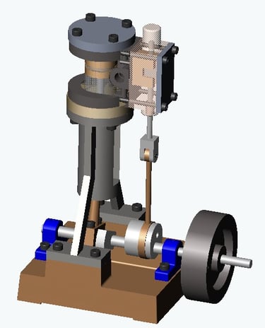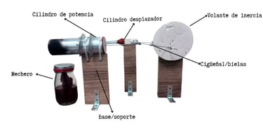 La Base/Soporte es la estructura fundamental que mantiene unidos y alineados todos los componentes del motor Stirling, como los cilindros y los pistones. Contribución al ciclo termodinámico: Proporciona estabilidad y permite el movimiento preciso. Es crucial porque asegura que las zonas caliente y fría permanezcan separadas y estables. Esto permite una transferencia de calor eficiente y la expansión/contracción controlada del gas de trabajo, esencial para generar potencia en el ciclo termodinámico. Sin ella, el motor no funcionaría de forma consistente.
